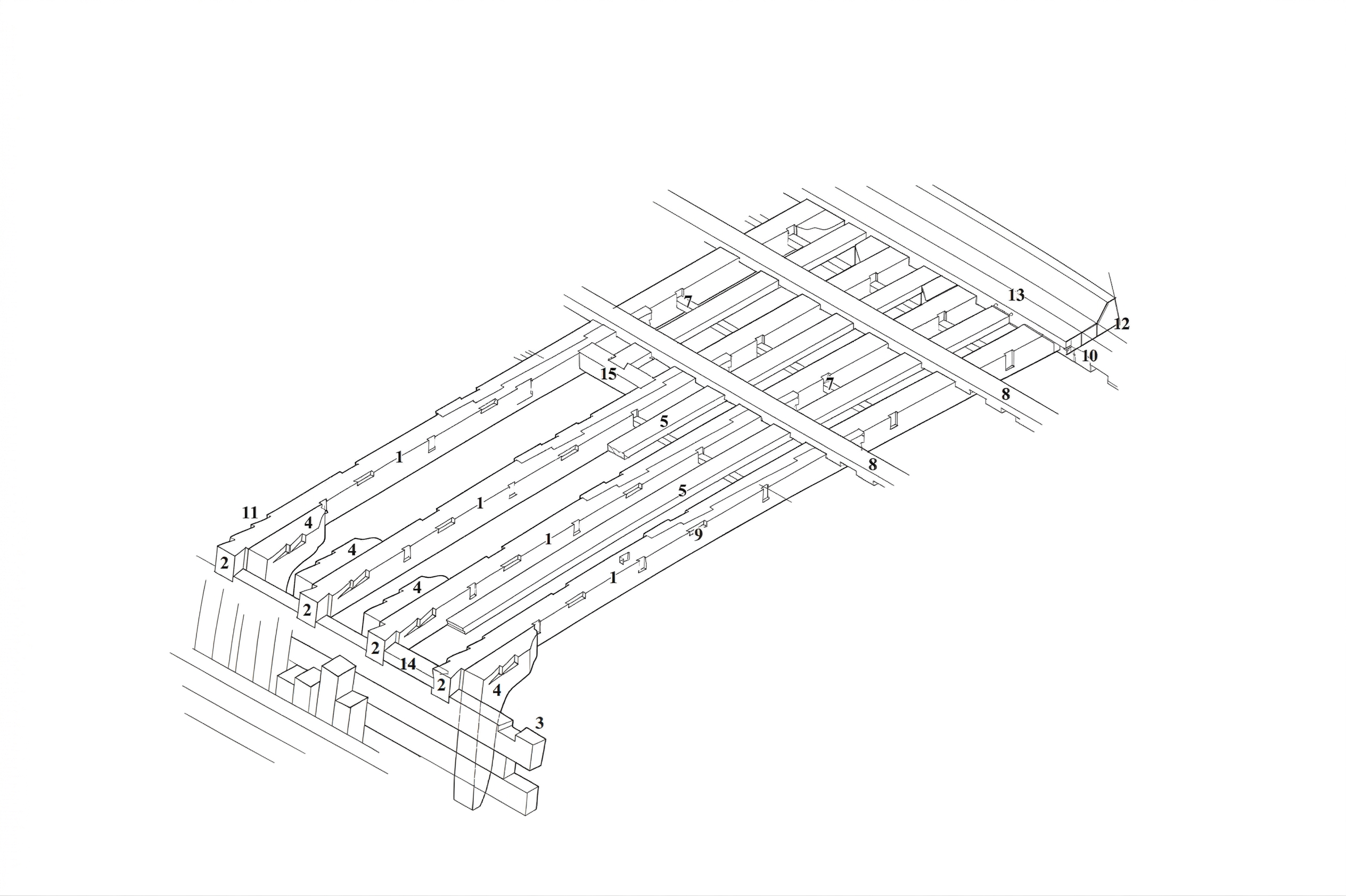 Entre les baux, on installe les barrotins, pièces plus légères qui viennent compléter l'espacement et renforcer la structure. L'ensemble constitue le squelette sur lequel viendront se poser les bordages de pont.