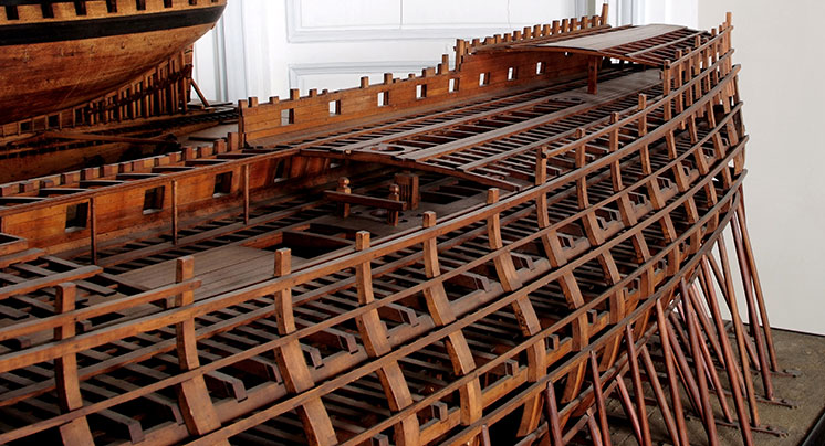 Dans les grands arsenaux royaux de Brest, Toulon ou Rochefort, l'édification d'un vaisseau suit une séquence rigoureuse. Avec les réformes de Colbert au XVIIe siècle, les ingénieurs constructeurs remplacent progressivement les anciens maîtres-charpentiers qui possédaient chacun leurs propres méthodes empiriques. Ils s’occupent désormais de la conception des plans. L’édification d'un vaisseau suit une séquence rigoureuse orchestrée par les maîtres de construction, ils doivent respecter scrupuleusement les plans, veiller au choix des bois et à leur mise en oeuvre.